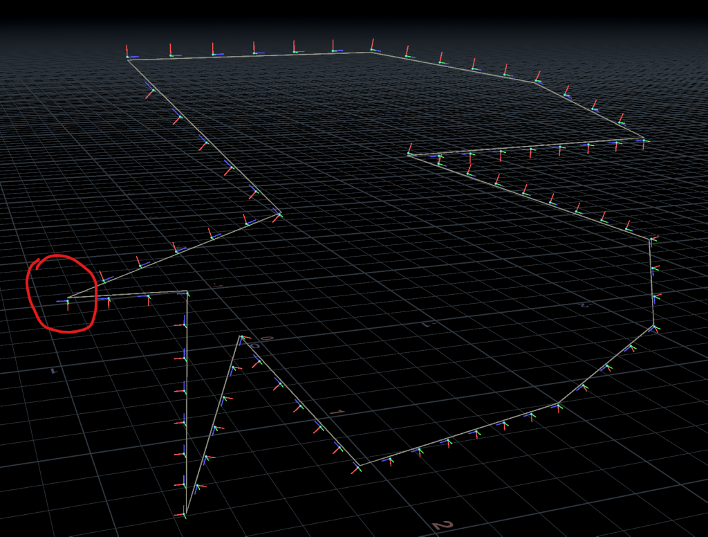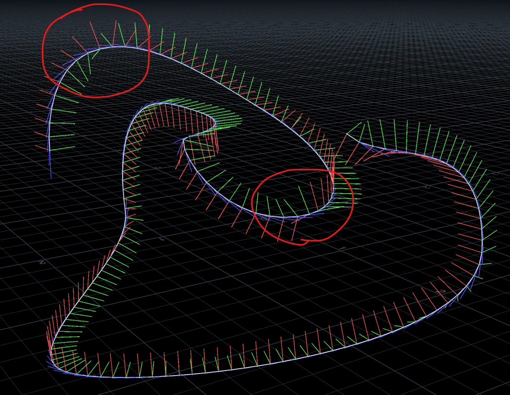 You can see in those circled areas that there are sudden flips in the green and red vectors. This happens in part because each point on the curve is more or less computing its local tangent (blue) and normal (green) vectors independently of any other location on the curve; they just look at their immediate neighbors and figure that’s good enough.