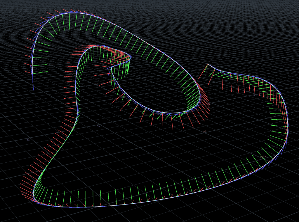 By incrementally applying these small rotations to the normal vectors along the length of the curve, the algorithm ensures that there’s no sudden flips or discontinuities in orientations while passing along the curve, regardless of how many twists and turns are present. Conceptually it’s not too bad! The implementation is, as always, the annoying part.