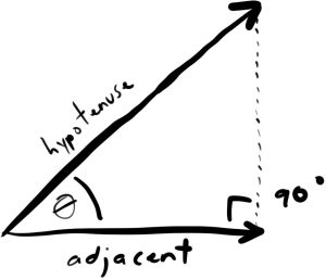 If you remember SOHCAHTOA from trigonometry class, you might remember what the cosine of a triangle is. The cosine is a measurement of the ratio (there’s that word again) between the adjacent side of a right triangle and the hypotenuse side, relative to a given angle. It’s easier to see this as an illustration: