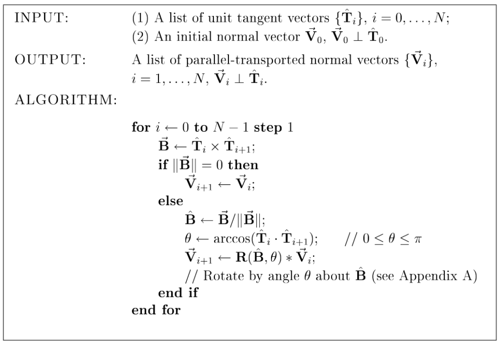 The core idea here is simple: starting at the beginning of the curve, get the tangent to the curve and a normal vector. Then for each successive point along the curve, figure out the angle that would rotate the previous tangent vector to match the next tangent. Then rotate the normal vector by that same angle, around the binormal (the red vector in the above images). The binormal is a fancy way of saying a vector that’s orthogonal to the tangent and normal vectors, meaning it’s an axis perpendicular to both those other vectors.
