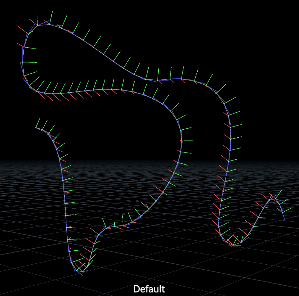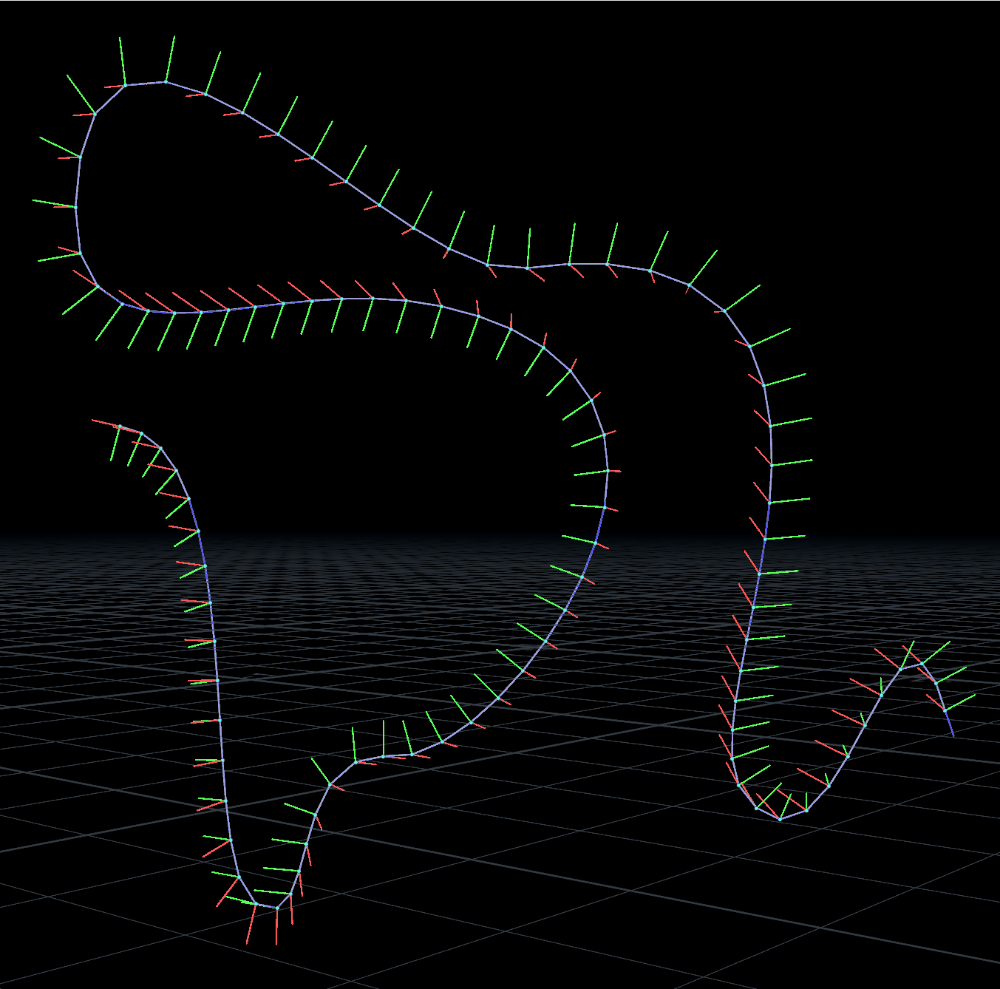 You can always add more stuff to this process to make things more useful or predictable. If the first curve normal is too similar to the first tangent, for example, you can’t meaningfully compute a binormal because the vectors are parallel. This often happens on straight vertical lines or circles. In cases like this it helps to have an optional normal override that the user can set before the tangent and normal arrays are filled: